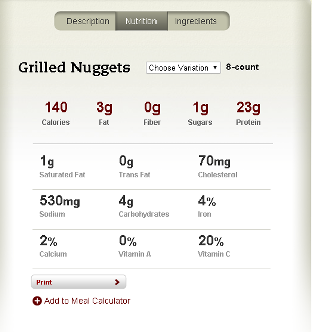 8 ct Chick-fil-A Nuggets. Most of those calories come from protein 42 and fat 41. Chick-fil-As Grilled Nuggets have a lot going for them.